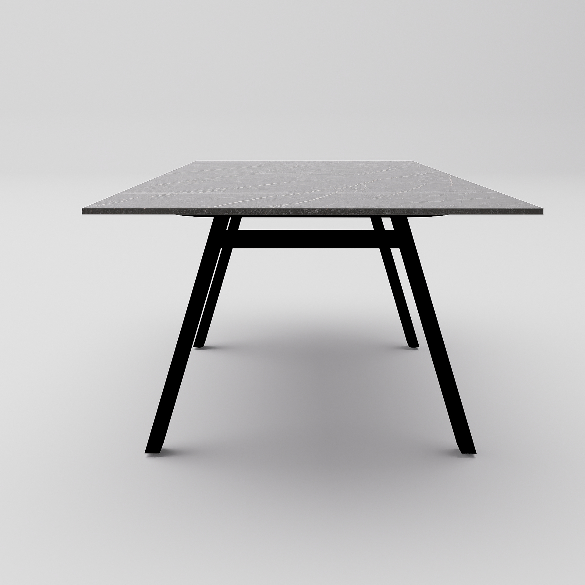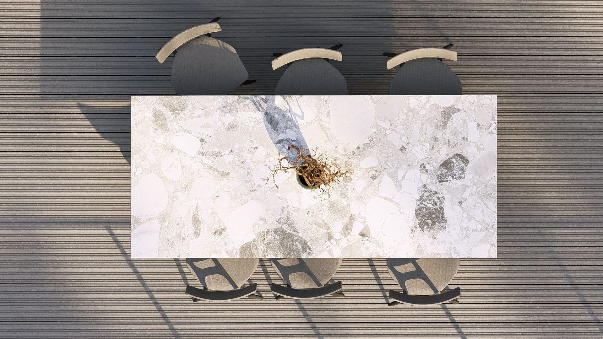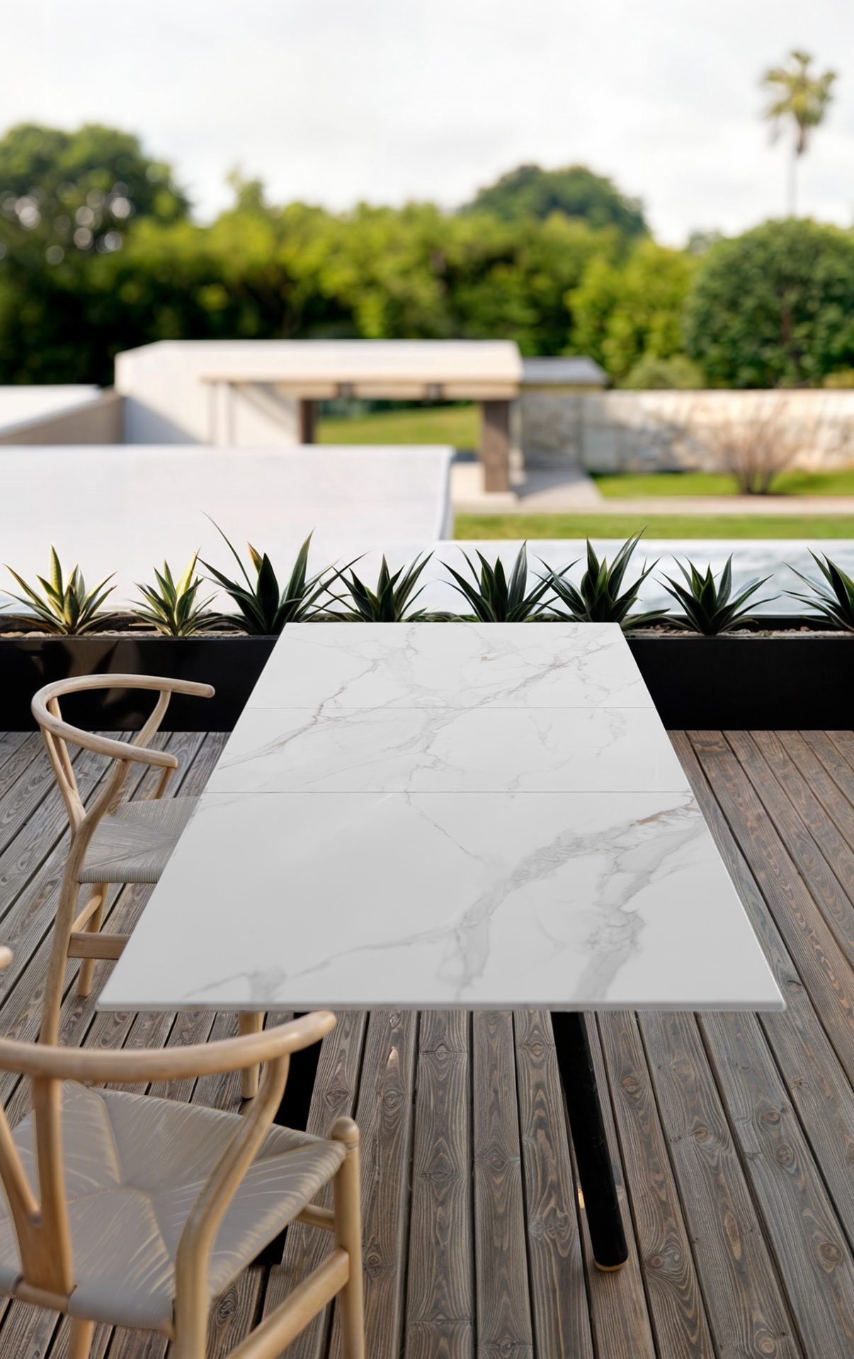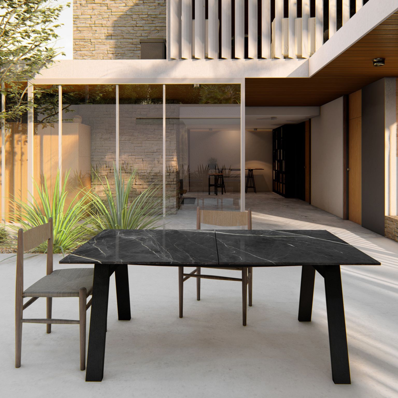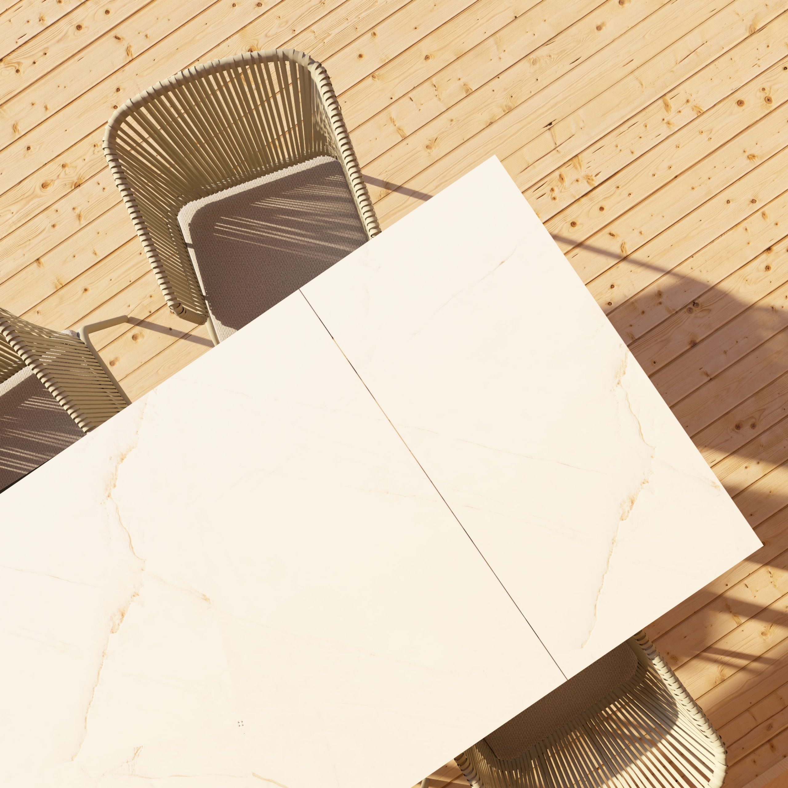 Estructura en aluminio ligero y resistente, sobre porcelánico técnico de alta gama y acabados que evocan la elegancia del mármol natural.Disponible en formato extensible de 180 cm a 240 cm, con una altura refinada de 75 cm y una solidez equilibrada de 68,5 kg.